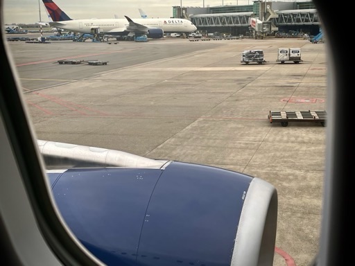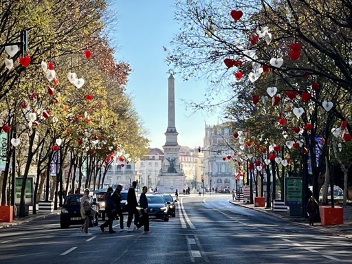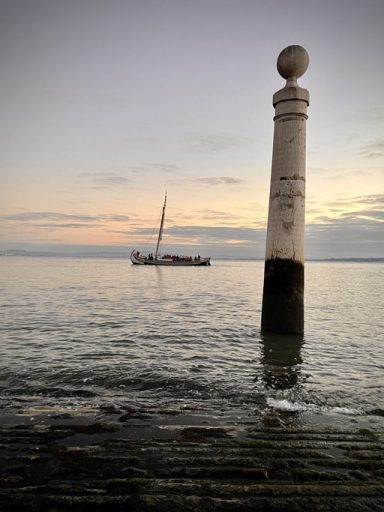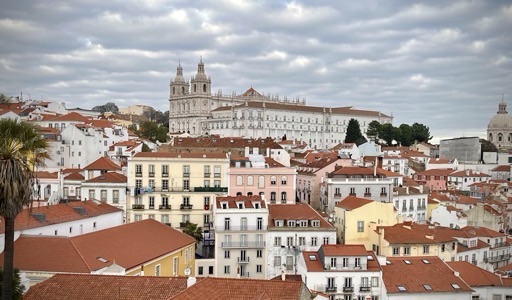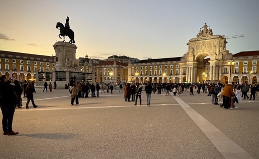 Starting with walking (with our to-be-checked luggage) to a bus stop in Setúbal. Bus to train station. Train to Lisbon. Subway to airport. Airplane to Amsterdam.
