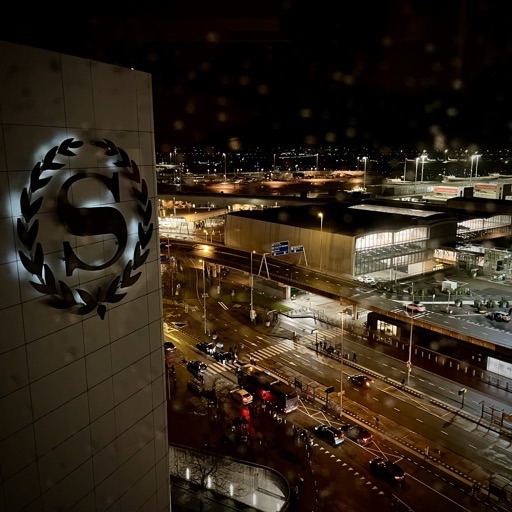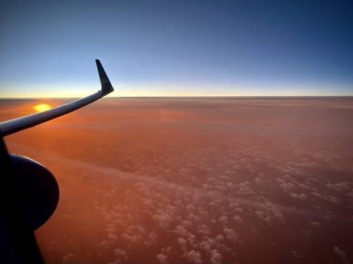 The view of sunset over Europe from the windowThe view of Schipol airport from the window